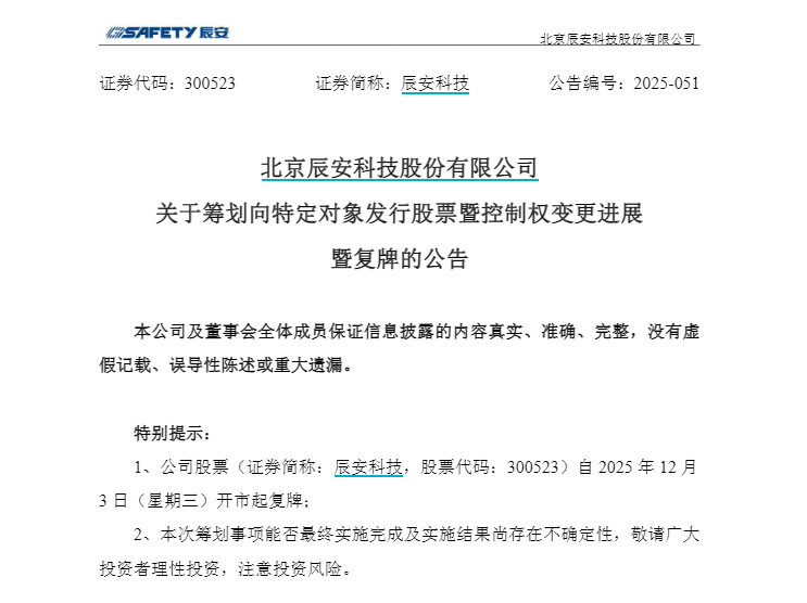 除了君亭酒店外,12月2日晚间,A股公司辰安科技(300523)也公告将迎来合肥市国资委增资入股,公司股票同样将于12月3日开市起复牌。