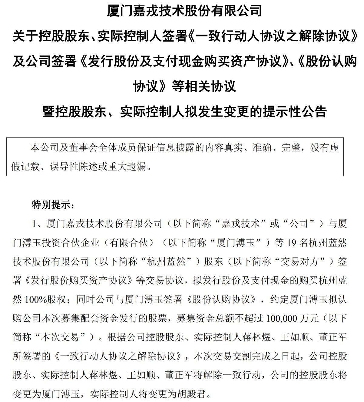 值得注意的是,此次重组方案涉及了嘉戎技术的控制权让渡。