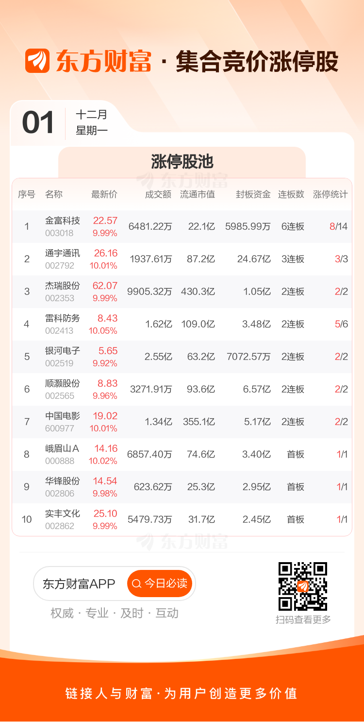 个股方面,12股竞价涨停,其中金富科技6连板、通宇通讯3连板、杰瑞股份2连板、雷科防务2连板、银河电子2连板。