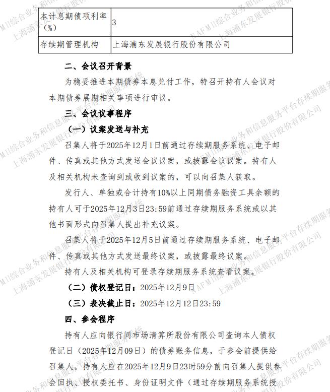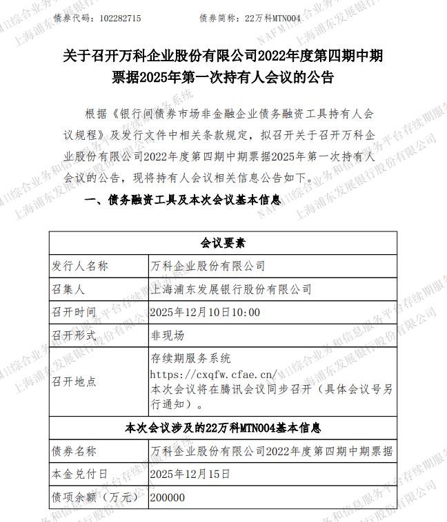 上海浦东发展银行股份有限公司今日发布一份关于召开万科企业股份有限公司2022年度第四期中期票据2025年第一次持有人会议的公告。根据《银行间债券市场非金融企业债务融资工具持有人会议程》及发行文件中相关条款规定,拟召开关于万科企业股份有限公司2022年度第四期中期票据2025年第一次持有人会议,本次会议召集人为上海浦东发展银行股份有限公司。会议召开背景,为稳妥推进本期债券本息兑付工作,特召开持有人会议对本期债券展期相关事项进行审议。本次会议涉及的22万科MTN004基本信息显示,该笔债券名称为万科企业股份有限公司2022年度第四期中期票据,债项余额20亿元,本金兑付日为2025年12月15日。