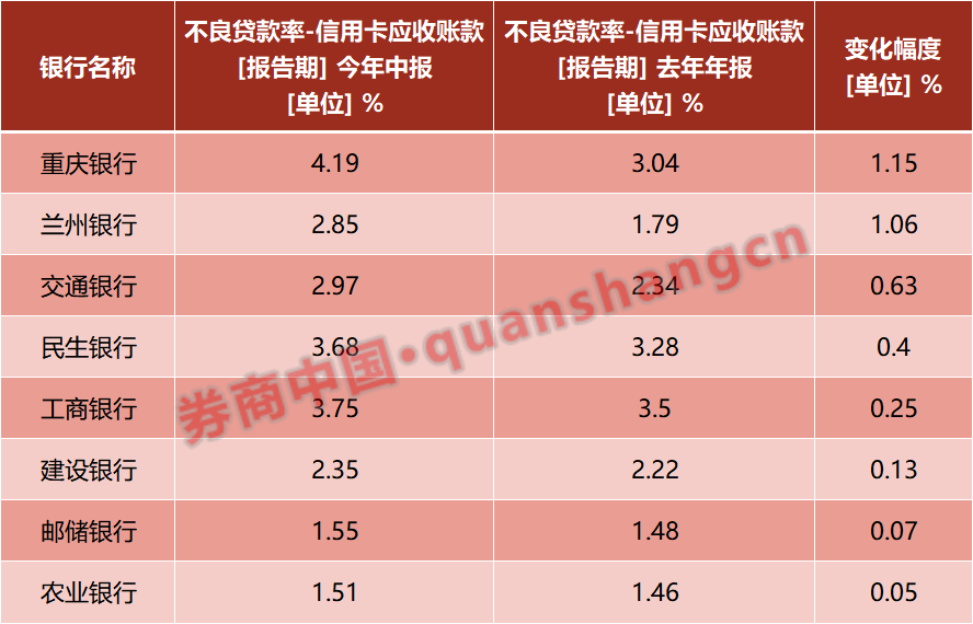 其中,6月末,重庆银行信用卡不良率较年初增加1.15个百分点至4.19%;兰州银行信用卡不良率较年初增加1.06个百分点至2.85%,增幅均超1个百分点。交通银行、民生银行、工商银行的信用卡不良率分别较年初增加0.63、0.4、0.25个百分点至2.97%、3.68%、3.75%。