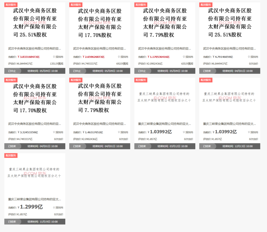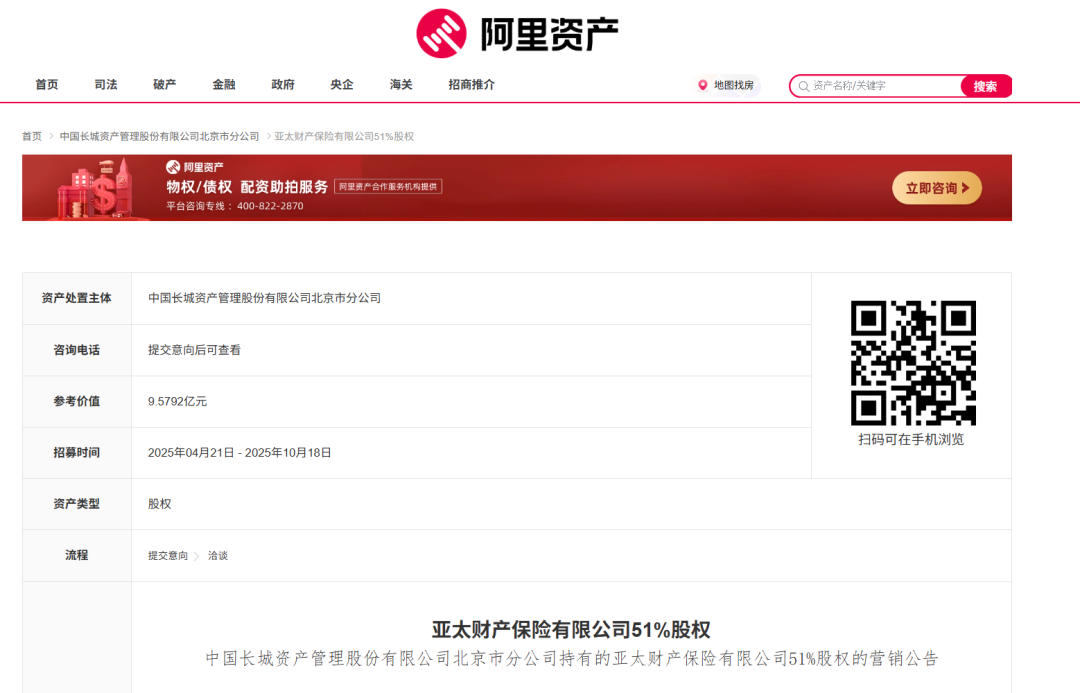 记者在阿里资产拍卖平台查询发现,长城资产北京分公司曾对上述股权进行招商推介,招募时间为2025年4月21日至2025年10月18日。公告给出的股权参考价值为9.58亿元,并认为保险牌照具备较高的投资价值,质押比例为51%有利于受让方控股财险公司,获得公司控制权。