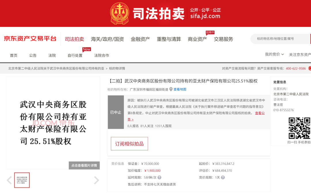 上证报记者致电处置机构北京市第二中级人民法院,相关工作人员表示,由于武汉中央商务区被移送法院进行破产审查,因此拍卖已中止,且短时间内不会再进行。