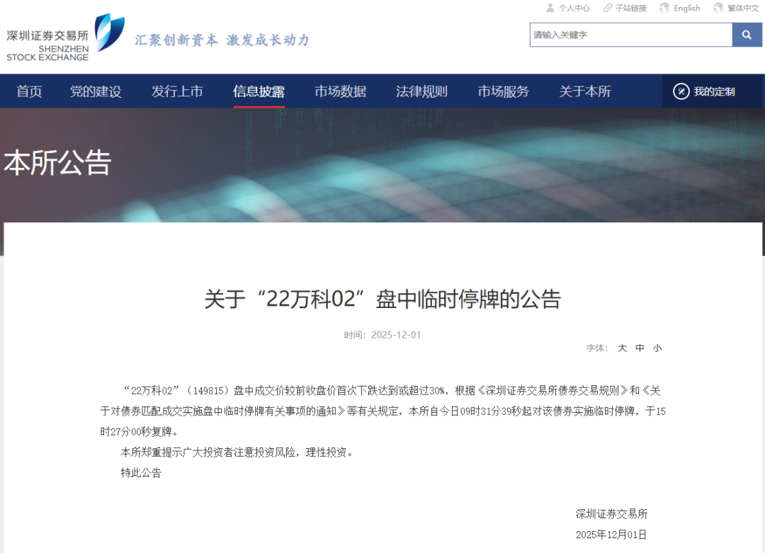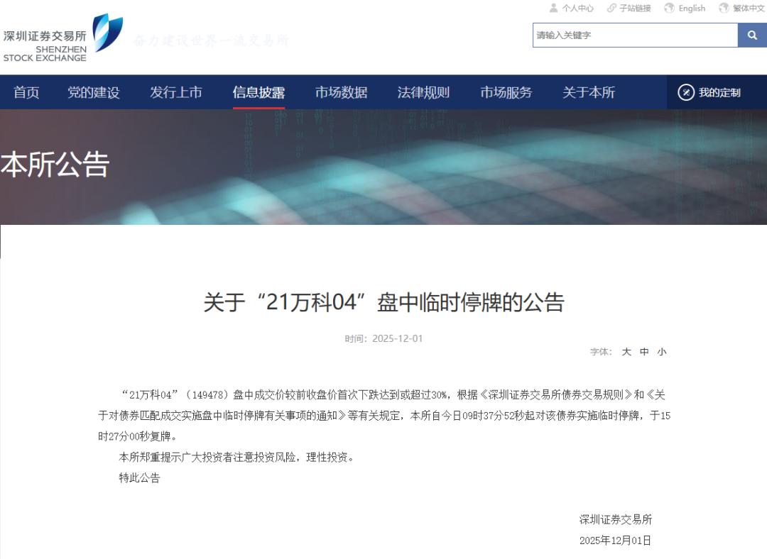 “21万科04”(149478)盘中成交价较前收盘价首次下跌达到或超过30%,根据《深圳证券交易所债券交易规则》和《关于对债券匹配成交实施盘中临时停牌有关事项的通知》等有关规定,深交所自今日09时37分52秒起对该债券实施临时停牌,于15时27分00秒复牌。