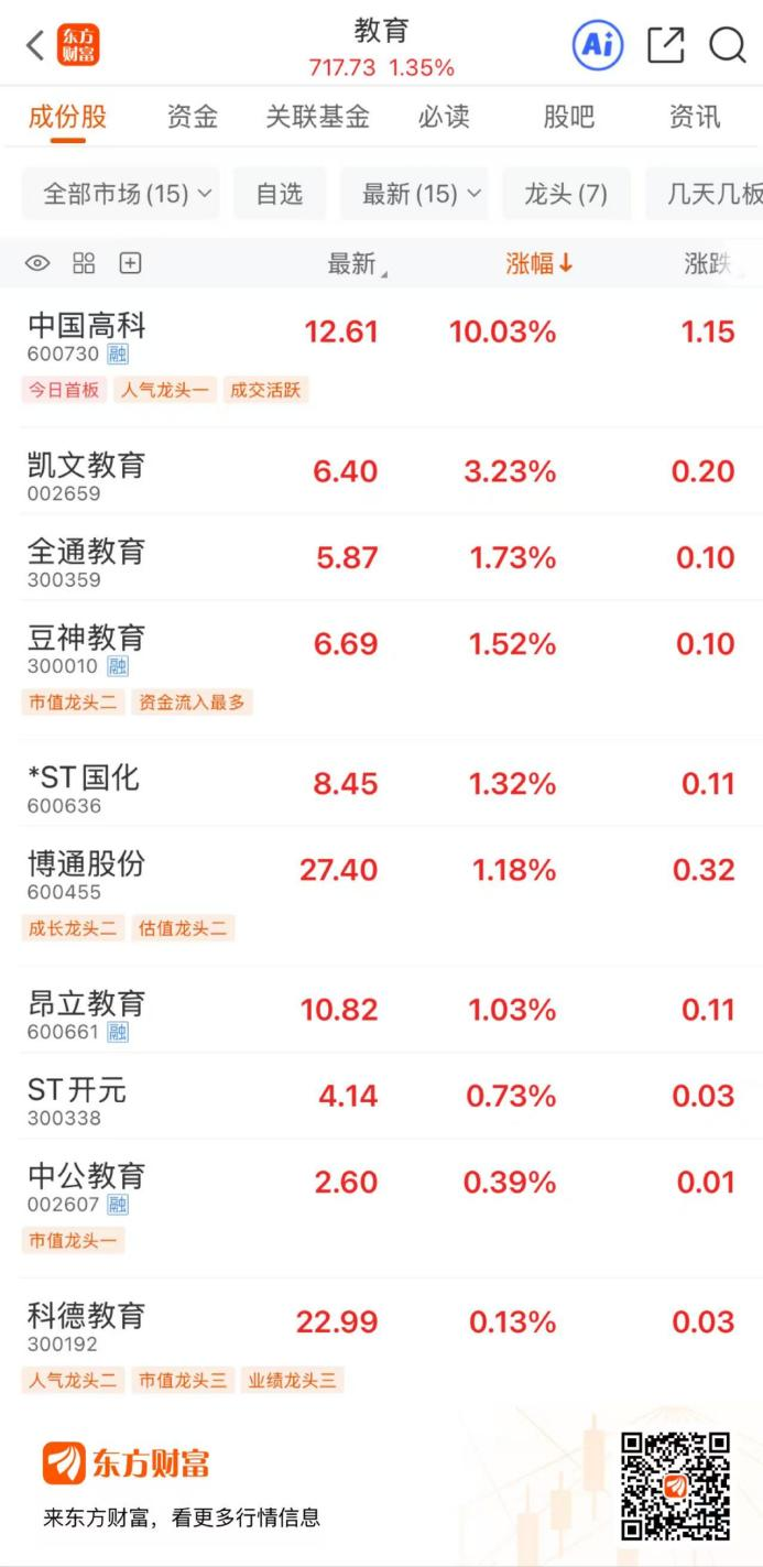 11月28日,A股“AI+”的风吹到了教育。截至早间收盘宁波无粘预应力钢绞线,教育板块上涨1.35%,涨幅在两市行业板块中位居前列。个股方面,中国高科涨停,凯文教育涨超3%,全通教育、豆神教育、*ST国化、博通股份、昂立教育等多股涨超1%。