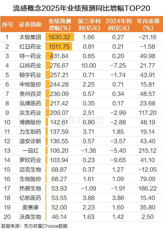 往后看,从机构的业绩预测来看,东方财富Choice数据显示,太极集团预计2025年归母净利润同比增长1630.32%。红日药业紧随其后,预计2025年业绩同比增长1511.75%。特一药业、以岭药业、翰宇药业等2025年业绩预测增幅也排名靠前。