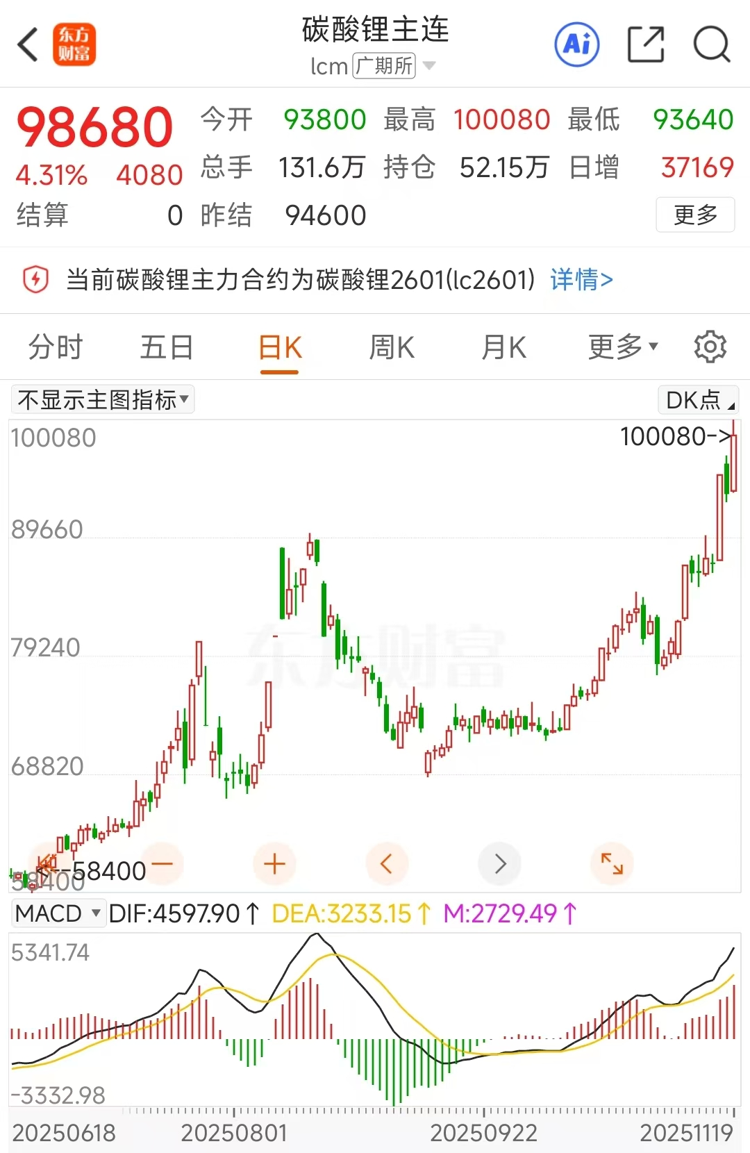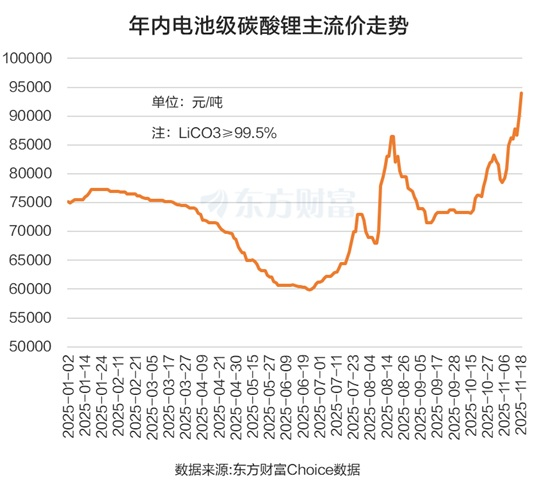 消息面上,碳酸锂期货主力合约11月19日盘中突破10万元/吨,而上一次该主力合约价格在10万元/吨上方还是一年前的2024年6月11日。自今年6月23日盘中触及5.84万元/吨的阶段新低开始,至11月19日早盘结束(报98680元/吨),碳酸锂主连已累计大涨65.63%。
