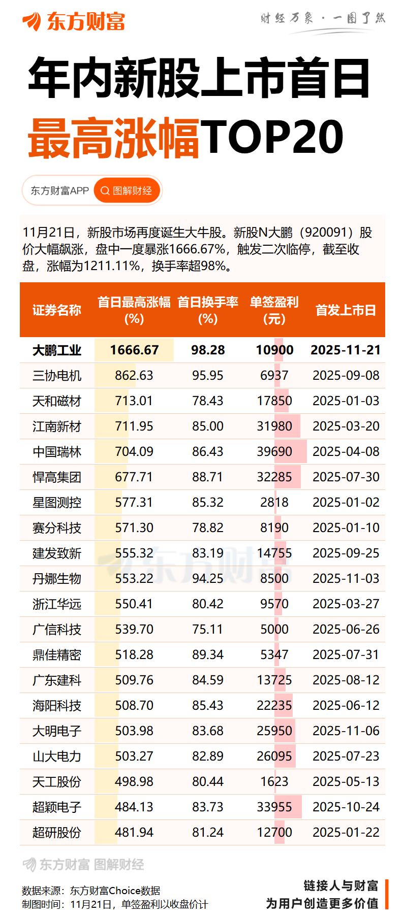 在A股市场集体调整的背景下,今日上市的新股N大鹏(920091)股价大幅飙涨,盘中一度暴涨1666.67%,触发二次临停,截至收盘,涨幅为1211.11%。据悉,大鹏工业是工业精密清洗领域专用智能装备生产商,客户包括比亚迪、长安集团、吉利汽车等。