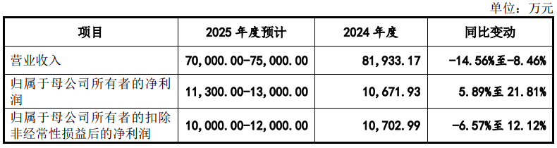 同时,公司预计2025年度营业收入约为7.0亿元~7.5亿元,同比变动幅度约为-14.56%至-8.46%;归属于母公司所有者的净利润约为1.13亿元~1.3亿元,同比变动幅度约为5.89%至21.81%;归属于母公司所有者的扣除非经常性损益后的净利润约为1亿元~1.2亿元,同比变动幅度约为-6.57%至12.12%。