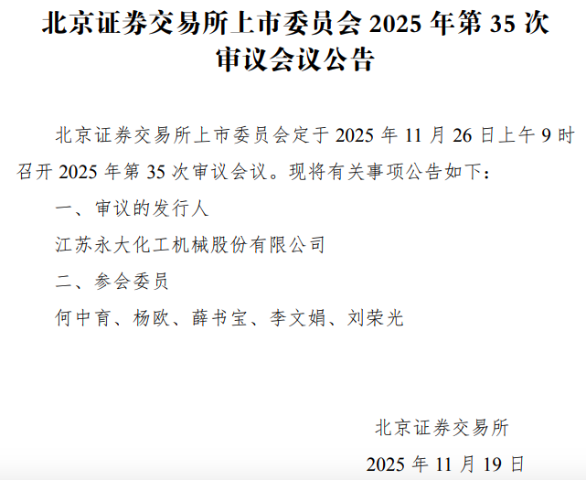 11月19日唐山预应力钢绞线厂家,北交所发布公告,江苏永大化工机械股份有限公司(以下简称“永大股份”或“公司”)将于2025年11月26日上会。