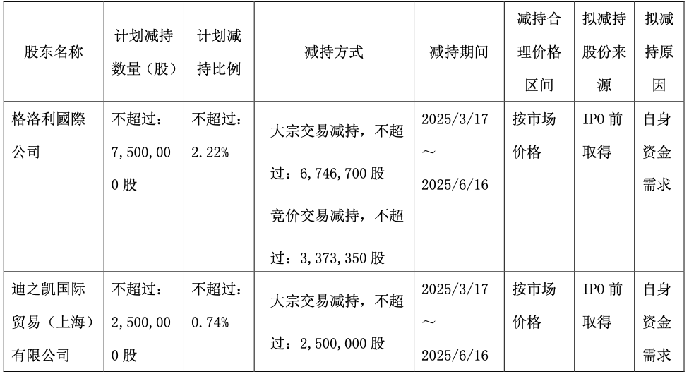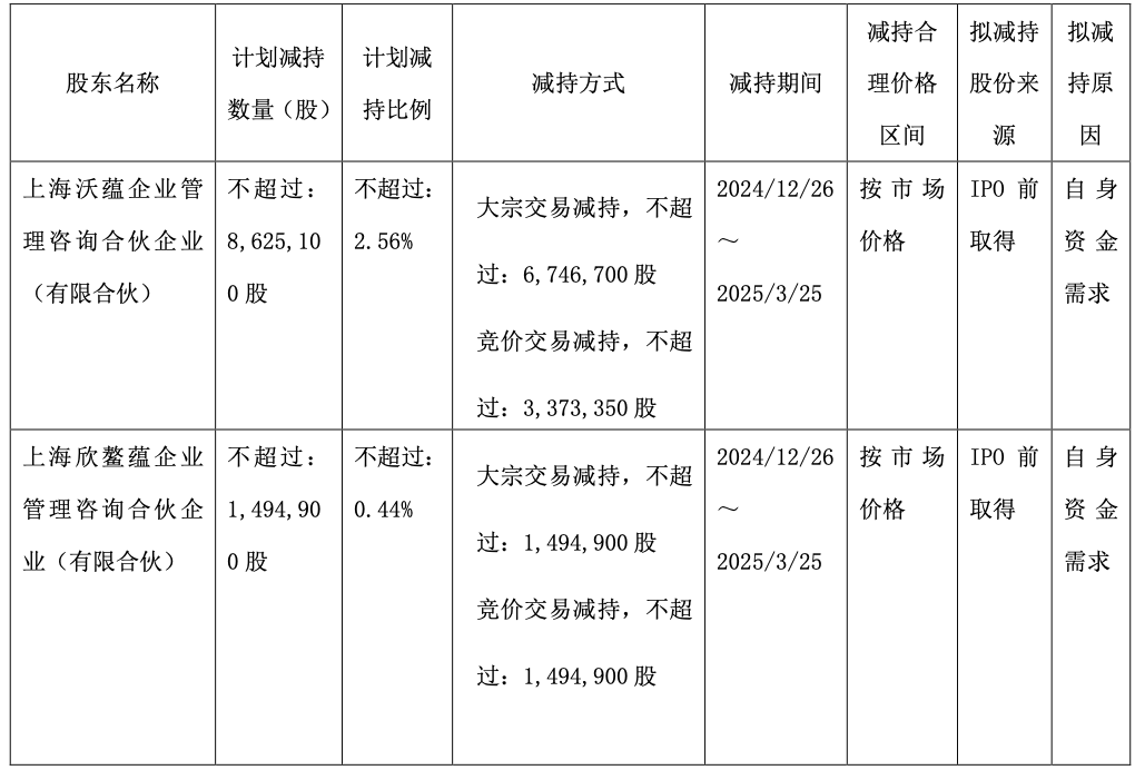 上海沃蕴与欣鳌蕴拟通过大宗交易及集中竞价交易方式减持公司股份合计不超过1012万股,即不超过公司总股本的3%。其中,通过大宗交易减持的,自本公告披露之日起15个交易日后的3个月内进行,合计减持比例不超过公司总股本的2%,任意连续90日内减持股份总数不超过公司总股本的2%;通过集中竞价交易减持的,自本公告披露之日起15个交易日后的3个月内进行,合计减持比例不超过公司总股本的1%,任意连续90日内减持股份总数不超过公司总股本的1%。