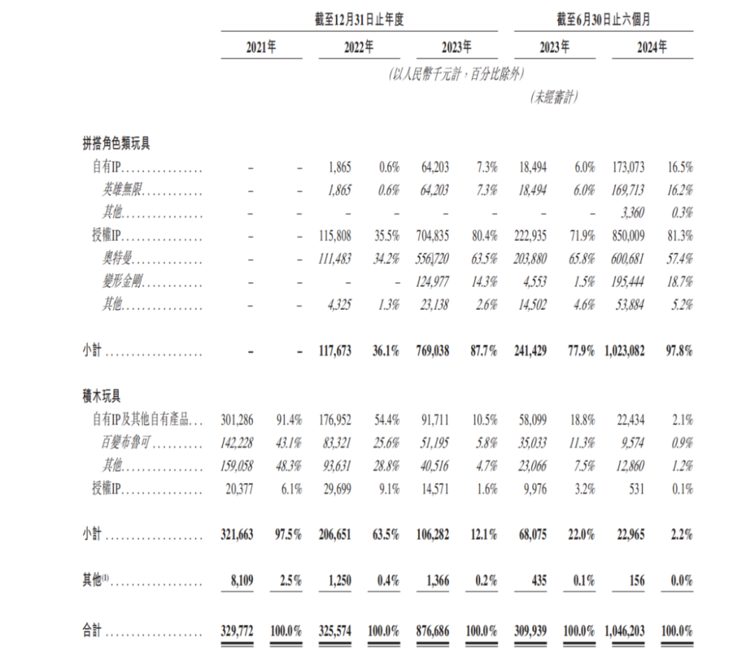拆解布鲁可的营收组成可看出,近年来公司的业绩增长动力主要来自拼搭角色类玩具,尤其是与奥特曼相关的IP。2023年及2024年上半年,布鲁可基于奥特曼IP的产品销售收入,分别占公司收入的63.5%及57.4%。