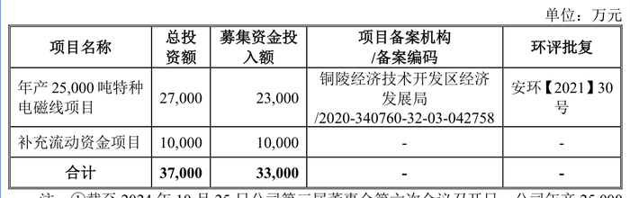 据悉,该项目具体包括15000吨节能环保型特种铝基电磁线、10000吨节能环保型特种铜基电磁线。项目由公司负责实施,项目总投资2.7亿元,拟以募集资金投入2. 亿元,项目建设期为18个月,项目建设地点位于铜陵市铜陵经济技术开发区铜胥路东侧、西湖三路南侧公司厂区内。
