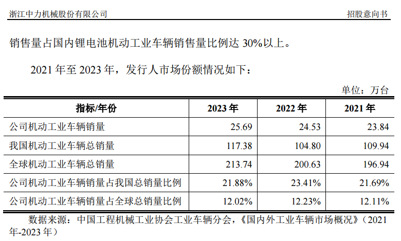 中国工程机械工业协会工业车辆分会的数据显示,自2019年起,中力股份的锂电池叉车产销量连续5年排名第一,2023年的销量占国内锂电池机动工业车辆销量的30%以上。