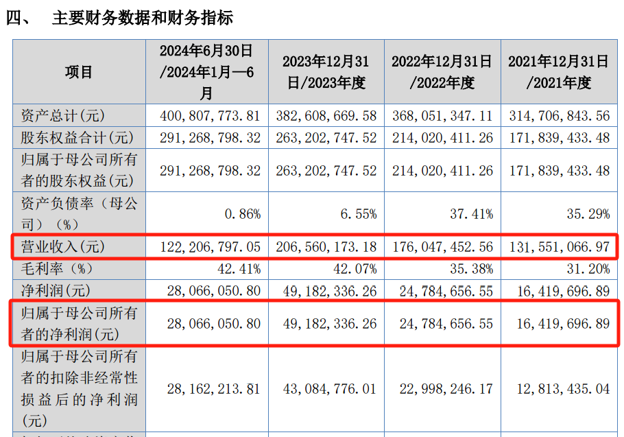 2021年至2023年及2024年上半年,林泰新材分别实现营业收入1.32亿元、1.76亿元、2.07亿元、1.22亿元;归母净利润为1641.97万元、 2478.47万元、4918.23万元、2806.61万元。