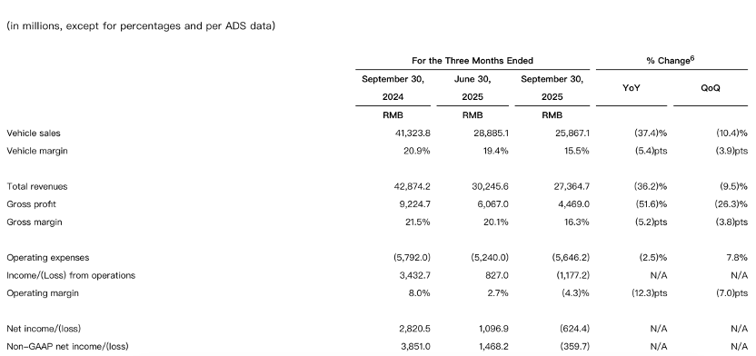 11月26日,理想汽车披露,公司在2025年第三季度实现营收273.65亿元,同比下滑36.2%,略高于市场预估的266亿元;第三季度净亏损6.24亿元,去年同期则为实现净利润28.21亿元;经调整(Non-GAAP)净亏损为3.6亿元,去年同期净利润为38.51亿元;截至第三季度末,理想汽车现金储备高达989亿元。