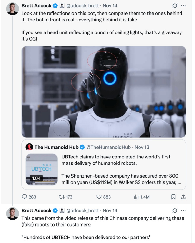 优必选表示,此次视频发布为优必选实现数百台全尺寸工业人形机器人Walker S2正式交付的里程碑,完全是现场真实拍摄。优必选官方账号已针对此不实说法发布了一镜到底、原速原声的视频素材,体现了现场的真实情况。