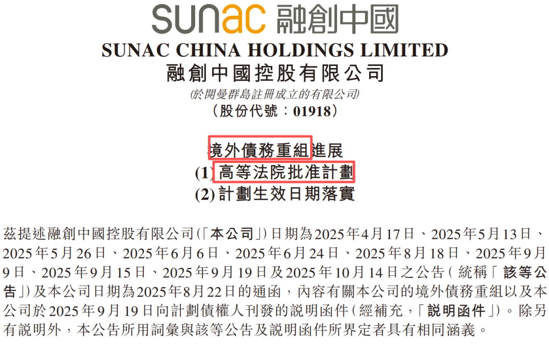 自今年初宣布启动以来,融创境外债重组稳步推进,4月公布重组方案,6月迈过75%支持率门槛,10月获98.5%债权人投票赞成,如今则获得香港高等法院批准生效。此次债务出清,将为公司接下来的保交楼收官、资产盘活和经营恢复打下基础。