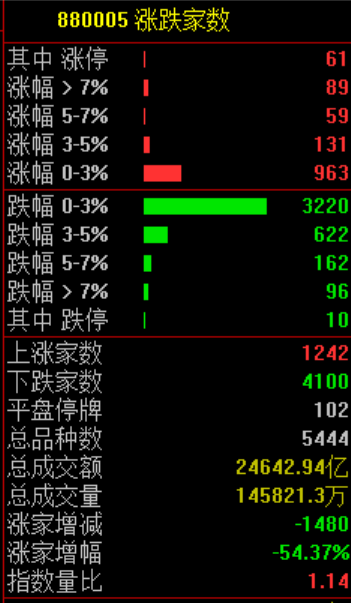 全市场共1242只个股上涨,61只个股涨停,4100只个股下跌。