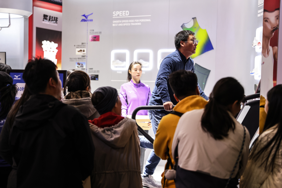 图为观众现场试穿全新路跑竞速鞋进行体验测试。