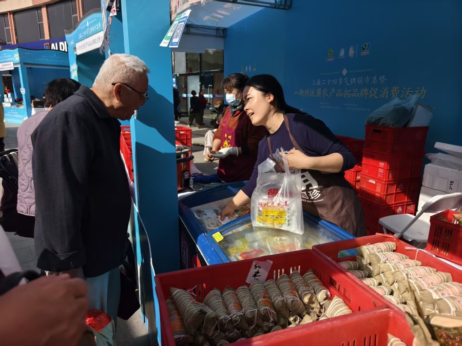 正值“秋风起,蟹脚痒”的季节,产自湖州太湖边的大闸蟹只只鲜活、黄满膏肥,是当下最为鲜美的时令佳肴。肥而不腻、热气腾腾的湖州湖羊蹄,咸味适中、肉质鲜嫩的鲜岗盐水鸡,软烂弹牙、卤香十足的牛筋牛腱,更是肉食爱好者不可错过的美食。软糯香甜的国芳枕头粽、米香浓郁的湖州生态新米、南浔红美人柑橘、刺毛肉圆、传统定胜糕等地道风味齐聚一堂,佐以熏豆茶、紫笋茶等特色茶饮,让上海市民在一站式体验中,深切感受到湖州优质农产品的独特魅力与品牌实力。