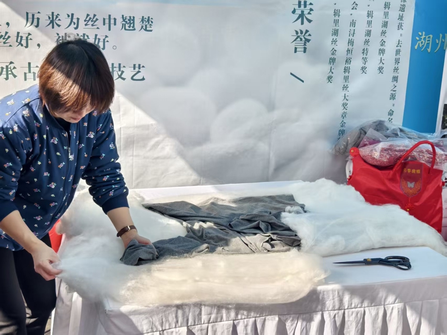 “辑里湖丝是我们湖州南浔的特产,在明清时期便负有盛名,一根蚕丝可以拉到1800米,同时悬挂7枚铜钱而不断,历来有“丝中翘楚”之称。”严利英一边剪裁缝制蚕丝棉衣,一边向顾客推销产品:“俗话说一斤蚕丝顶三斤棉花,这些棉衣的内芯是100%天然桑蚕丝,套子面料选用珍珠棉,亲肤柔软不起球,一件手工蚕丝棉衣才卖260元,肯定是物美价廉。”严利英告诉新民晚报记者,蚕丝棉衣很受老年人欢迎,半天就卖出了9件,她一上午都没停下来休息过,“老人冬天怕冷,既想穿得暖和,又不希望厚重笨拙,蚕丝棉衣正适合他们。”