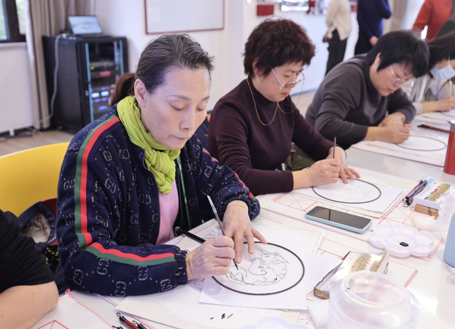“大家先用浓墨勾五官,淡墨勾毛发,再给猫的不同部位赋色。”图文展左侧的手工教室,在青年画家陈汉煜手把手指导下,居民们尝试亲手制作纨扇,所绘图案正出自图文展中任伯年的《四猫图轴》。