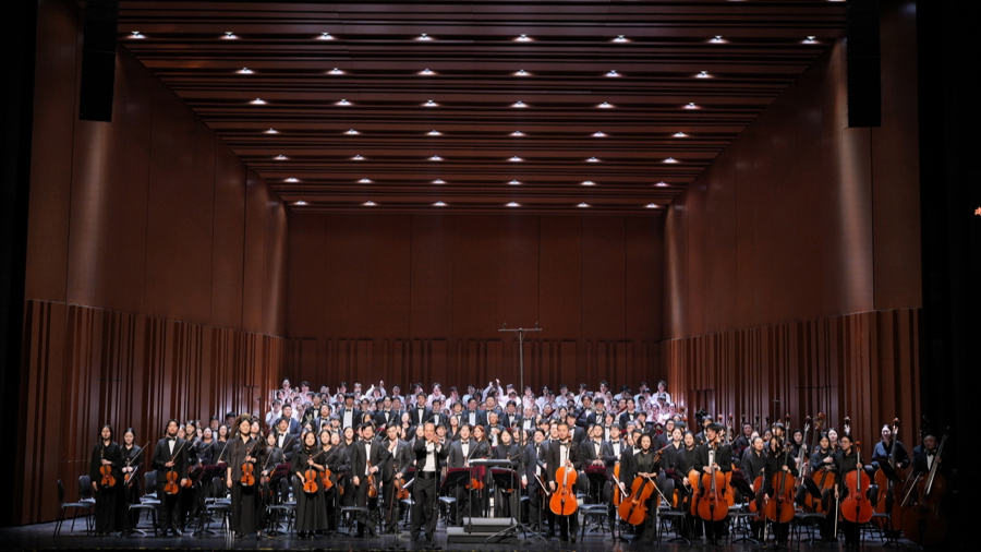 舞台上,孩子们清澈的歌声与交响乐团的磅礴音响交织,构建起一幅跨越地域、连接东西的壮阔音画。朗诵者杨杨的深情道白,与声歌系教授赵勇、青年教授陈家坡和张曦、顾文梦的精彩领唱相得益彰,共同完成了这部音乐巨作。